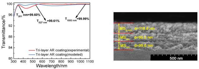 代表著溶膠凝膠法制備多層減反膜的*高水平。由三層折射率漸變的MgF2/SiO2混合膜構(gòu)成,對1053nm、527nm、351nm三個波長的透射率同時達(dá)到99.6%以上,可以有效消除高功率固體激光器窗口元件表面的雜散光。